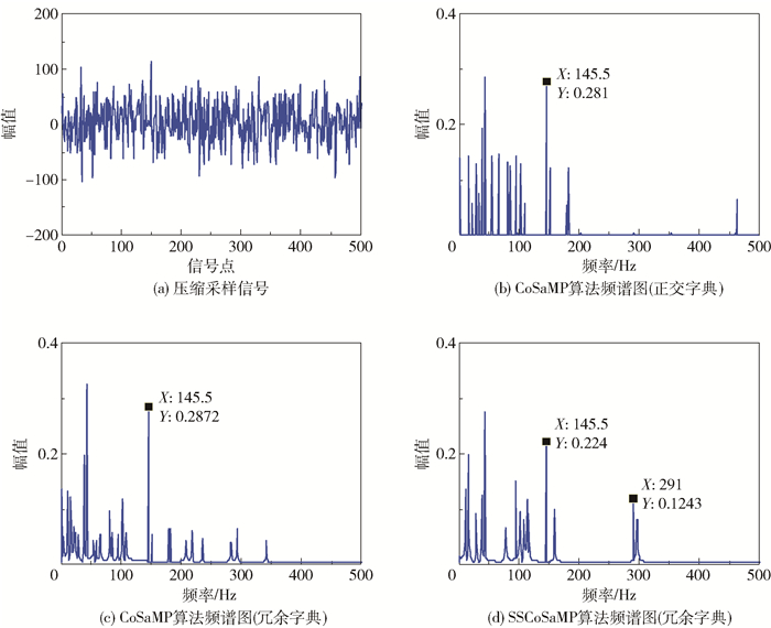 由图 2看出,采用正交字典和冗余字典的CoSaMP算法得到的重构信号只提取出了1倍故障特征频率,而采用本文算法得到的重构信号提取出了1倍、2倍故障特征频率,证明本文方法提高了信号的重构精度。