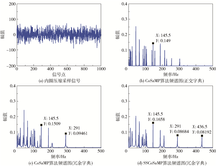 压缩率25%下,首先应用CoSaMP算法重构原始信号,分别采用正交字典和冗余字典进行实验以比较二者的信号重构精度,再应用本文提出的SSCoSaMP算法重构原始信号。3种方法得出的重构信号包络频谱图如图 2(b)、(c)、(d)所示。