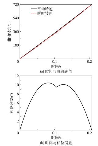 图 6 转速波动平稳工况下时间与曲轴转角及时间与相位偏差关系 Fig.6 The relationships between time and crank angle, and time and phase deviation under steady speed fluctuation |