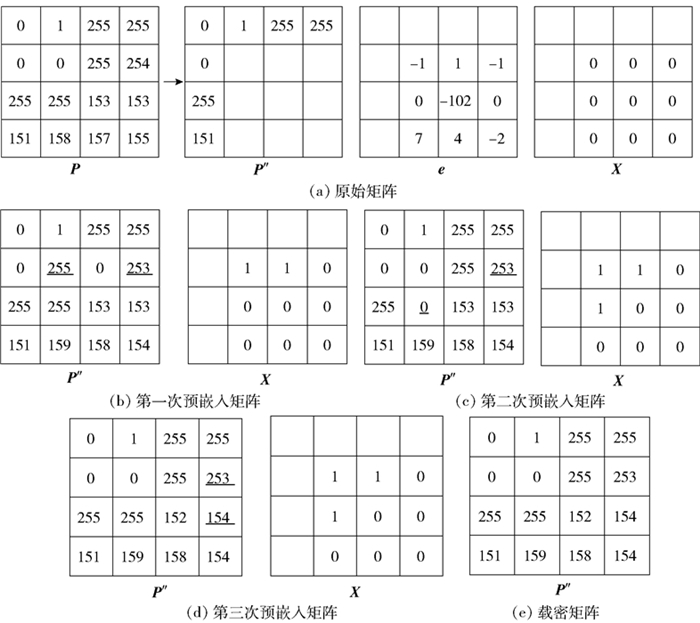 图 1展示了信息嵌入过程中像素值的变化过程,图中下划线为每次嵌入信息的位置。嵌入2 bit信息(1, 1)时,图(b)、(c)、(d)分别为第一、二、三次预嵌入信息后P″和X的变化情况。第一、二次预嵌入时,由于嵌入信息处有像素值溢出,信息嵌入失败;第三次预嵌入时,无像素值溢出,信息嵌入成功。剩余像素值根据嵌入算法进行变化,最后生成的载密图像如图 1(e)中所示。