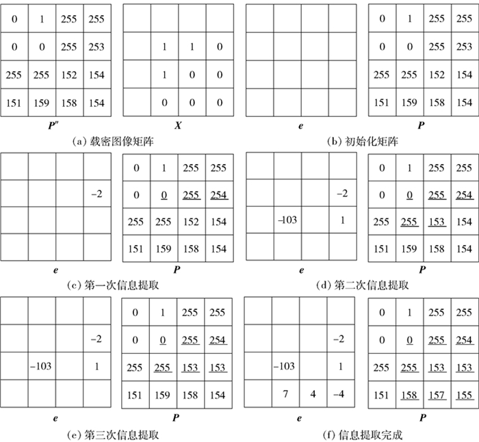 图 2展示了信息提取过程中像素值的变化过程,图中加下划线数字为已还原的像素值,图 2(f)中的P为已还原的原始图像的像素矩阵,提取2 bit信息(1, 1)时,图 2(c)、(d)、(e)分别为第一、二、三次提取信息后e和P的变化情况。与图 1原始矩阵对比可知,恢复后的图像与原始图像完全相同。