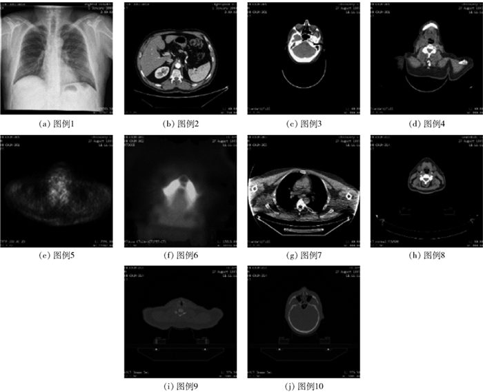 3.1 嵌入量从100张医学图像中随机选取如图 3所示的10张图像(按原顺序编号),以文献[10]中MPE算法的最大嵌入量为标准进行计算。假设测试图像时MPE算法的最大嵌入量为53 008 bit,则随机产生53 008 bit信息,利用本文算法计算嵌入量,并将测试结果与文献[10]中MPE算法的最大嵌入量进行对比,结果如表 1所示。再从100张非医学图像中随机选取10张进行同样的实验,并与文献[10]MPE算法进行比较,结果如表 2所示[14]。
