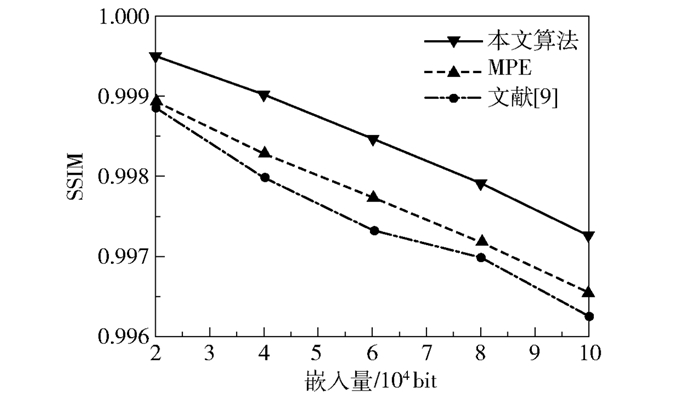 3.3 SSIM嵌入信息后,载密图像相比原始图像会有一定差异,为防止载密图像在传输过程中被检测到,需保证人眼无法察觉到载密图像的变化。在不同嵌入量下,以图 3(f)为测试样本计算SSIM值,并与MPE及文献[9]进行对比,结果如图 4所示。