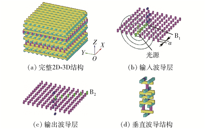 经过几十年的研究和应用,光子晶体的光学器件小型化已经趋于完善,光学器件的集成化越来越受到重视,而高密度光子集成器件是实现光通信的重要组成部件。三维光子晶体具有完全带隙等重要的物理性质,可以作为超密集新型光学器件的良好平台[1-3]。三维的woodpile结构由于加工工艺简单受到了广泛的关注,学者们相继报道了很多相关的重要研究成果[4-9]。近年来,结合2D光子晶体和woodpile结构的2D-3D异质结结构因其能实现非平面集成电路,成为了新的研究热点。Zhang等[10]通过扰动法、周期性变化法、平滑优化法对45°和90°波导进行优化,有效地提升了传输效率和导带宽度;Chutinan等[11]设计的2D-3D异质结结构全光微型芯片具有高带宽、低损耗等特性。3D微型芯片能在每个平面层中实现200nm的单模波导,在非平面层中可实现100nm带宽的传输。Tang等[12]将二维平板光子晶体嵌入woodpile结构中,以达到抑制平板微腔的辐射、减小损耗、增大品质因素的目的,获得了高达105的Q值;Chutinan等[13]搭建了3种不同2D-3D的异质结构集成电路,进一步证明了该结构在全光集成电路领域的重要应用价值。