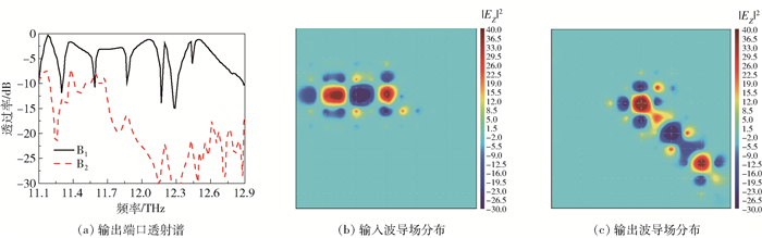图 2 集成波导器件的透射谱和输入、输出波导在11.59THz时的场分布图 Fig.2 Transmission spectra of the integrated waveguide and the field distributions of the input and output waveguide at a frequency of 11.59THz |