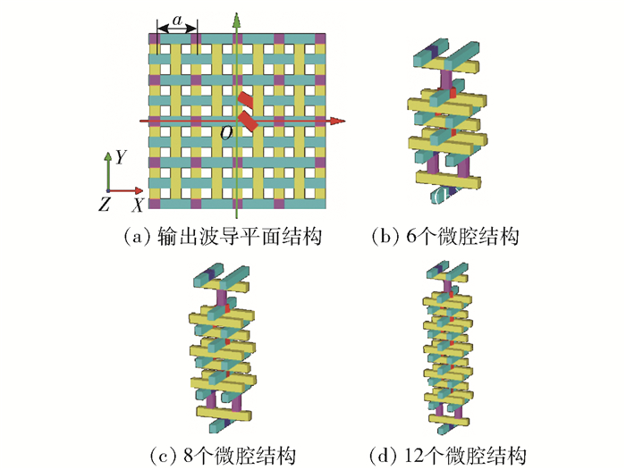 腔腔耦合垂直耦合波导区别于普通介质柱波导的优势在于,其每个腔都是独立的且可以旋转,因此本文考虑垂直波导中微腔旋转对传输特性的影响。为了保证高传输效率,要求接近输出波导的微腔旋转角度恰好为45°。图 3(a)中,靠近输出波导的微腔旋转后其振动方向恰好指向输出波导的方向。为了保证与输出波导相邻的介质柱正好旋转45°,考虑增加中间woodpile结构的层数,设计了3种旋转角度:①6个微腔,中间4个微腔旋转角度分别为0°、15°、30°、45°,如图 3(b)所示;②8个微腔,中间6个微腔的旋转角度分别为0°、9°、18°、27°、36°、45°,如图 3(c)所示;③12个微腔,中间10个微腔旋转的角度分别为0°、5°、10°、15°、20°、25°、30°、35°、40°、45°,如图 3(d)所示。可以发现,3种旋转角度下邻近微腔之间的夹角分别为15°、9°、5°,且随着旋转角度的减小微腔数目增加,输入、输出波导之间的距离由2.1a增加到5.4a。