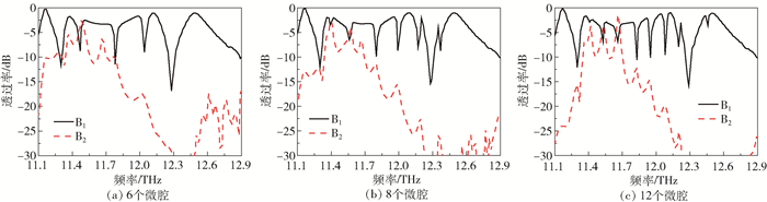 图 4 垂直波导在不同微腔数下的透射谱 Fig.4 Transmission spectra for the vertical waveguide with different numbers of cavities |