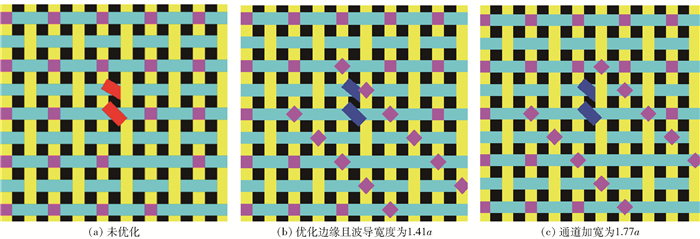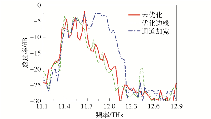 为了进一步改善集成波导的输出效率,对输出波导也进行了一定程度的优化设计。由于输出波导沿着45°方向出射,且波导两侧介质柱的排列是由二维光子晶体结构决定的,导致波导两侧介质柱的排列不整齐。文献[10]的理论模拟结果表明,通过对输出波导两侧介质柱的优化设计,可以一定程度上提高波导的传输效率。因此在保证相邻微腔的旋转角度5°的条件下,对如图 5(a)所示的45°输出波导边缘进一步优化。首先通过增加波导两侧介质柱数目来减小相邻介质柱之间距离(图 5(b)),此时相邻介质柱距离为0.5a;同时将正方形截面介质柱旋转45°,使输出波导两侧的散射减弱,此时波导宽度为1.41a。在此基础上,进一步将波导宽度增加到1.77a(图 5(c)),研究波导宽度对透过率的影响。采用时域有限差分方法模拟计算了3种设计的透射谱,结果如图 6所示。比较发现,边缘优化对波导传输特性的影响较弱,优化前后透射谱变化不明显; 当波导宽度增加到1.77a时,导带宽度明显增加(11.41THz~12.05THz),透过率也得到有效的提升。这一结果充分说明同时优化波导边缘和增加输出波导宽度可以显著提高波导的透过率,实现宽频带、低损耗的传输。