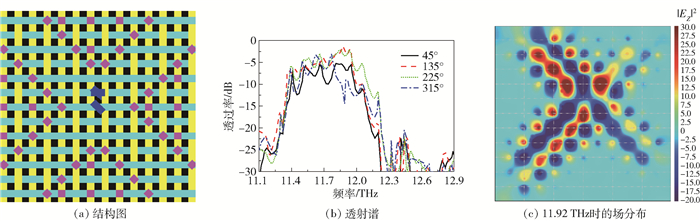 图 7 集成波导输出层结构图、透射谱及其11.92THz时的场分布 Fig.7 The structure of the integrated waveguide, the transmission spectra and the field distributions at a frequency of 11.92THz |