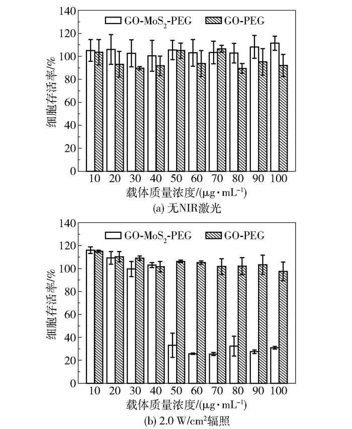 本文制备了一种PEG接枝量为6.8%的GO-MoS2-PEG复合物,其生物相容性良好,具有明显的光热转换的特性;质量浓度为50μg/mL的纳米复合材料在功率为2.0W/cm2的808nm激光下照射10min,其温度可升至50.5℃,相对细胞存活率仅为30%左右,可对癌细胞起到有效的杀灭作用。