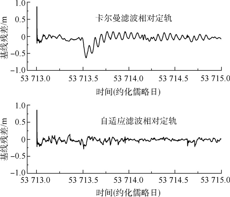 从表 1可以看出:卡尔曼滤波相对定轨和自适应滤波相对定轨精度明显高于几何法的相对定轨精度,3种方案中自适应滤波相对定轨精度最高,其结果与JPL轨道差值在3个方向上可以达到7cm的精度,基线精度可以达到6cm,且不存在明显的系统差.