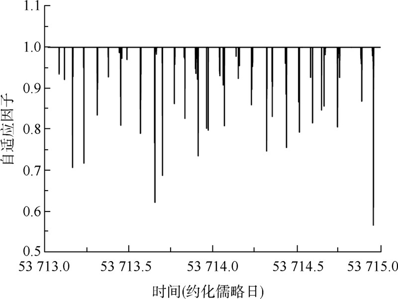 图 2给出了卡尔曼滤波相对定轨和自适应滤波相对定轨的基线残差图.图 3给出了自适应因子的变化情况.