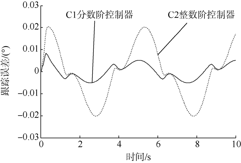 为测试外干扰力矩抑制能力,给定转台内框马达0°的常值位置指令,在0.1 s时刻加入100 N·m方波的干扰力矩,外干扰力矩如图 8所示.跟踪误差对比曲线如图 9所示.本文提出的分数阶控制器的最大跟踪误差为0.061°,而整数阶控制器的最大跟踪误差为0.075°.故强外干扰力矩的影响下,本文所提出的分数阶控制器要比传统的整数阶积分滑模控制器具有更强的鲁棒性.