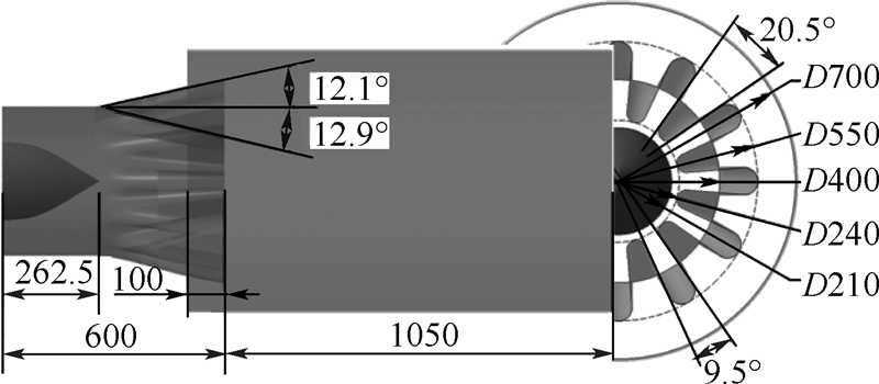 图 1所示为引射混合模型,图中波瓣喷管为基准波瓣喷管(BLN,Baseline Lobed Nozzle).喷管入口为环形截面,内圆直径210mm,外圆直径400mm.喷流绕流整流锥由环形截面过渡到圆形截面,整流锥长262.5mm.波瓣外瓣角12.1°,内瓣角12.9°,喷管出口距喷管入口截面600mm,当量直径d=400mm,波峰处直径550mm,波谷处直径240mm.直混合管直径D=700mm,入口在基准波瓣喷管出口前100mm,出口在基准波瓣喷管出口后1050mm,混合段长径比L/D=1.5.