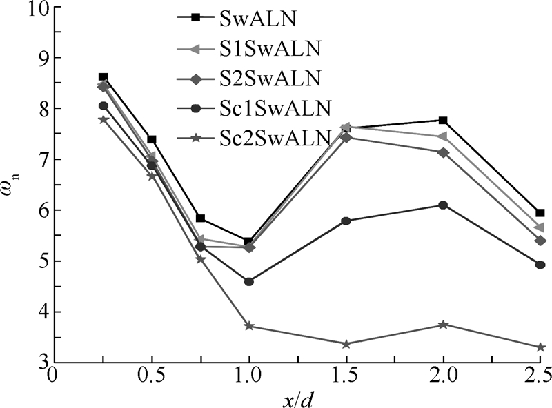 | 图 10 各交变波瓣沿程截面正交涡无量纲平均涡量 Fig 10 Nondimensional average normal vorticities along the axis of each alternating lobed nozzle |