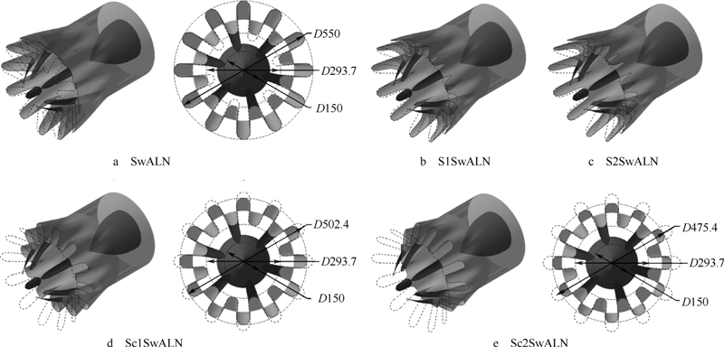 图 2a为剑形深波谷交变波瓣喷管(SwALN,Sword Alternating Lobed Nozzle),图 2b为剑形深波谷交变波瓣喷管扇形处理1(S1SwALN,Scalloped No.1 Sword Alternating Lobed Nozzle),图 2c为剑形深波谷交变波瓣喷管扇形处理2(S2SwALN,Scalloped No.2 Sword Alternating Lobed Nozzle),图 2d为剑形深波谷交变波瓣喷管斜切处理1(Sc1SwALN,Scarfed No.1 Sword Alternating Lobed Nozzle),图 2e为剑形深波谷交变波瓣喷管斜切处理2(Sc2SwALN,Scarfed No.2 Sword Alternating Lobed Nozzle).图中喷管出口处虚卷绕线为改型前出口形状,实卷绕线为改型后出口形状.