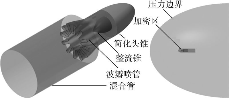 数值模拟模型如图 4所示,因波瓣喷管外形复杂,整个流场区域采用非结构网格进行划分.从壁面外推3层附面层网格,最内层厚0.05mm.在速度、温度变化剧烈区域进行网格加密,加密区网格面边长最大值在15mm左右,这样能比较精确地捕捉流向涡.加密区网格数在2000万以上,加密区外网格数为200万左右.