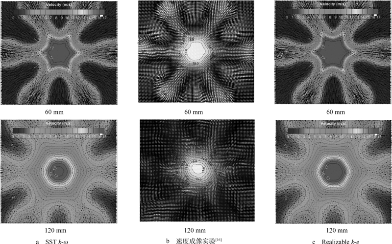 Hu等人[16]对一个六波瓣喷管做了一系列粒子速度成像实验,依据文献[16]中的几何参数建立六波瓣喷管模型.网格划分方式与数值模型一样,但随尺寸变化对网格大小进行调整.喷管入口喷流温度设为300K,速度与实验一致,湍流模型分别采用SST k-ω模型和Realizable k-e模型,其余计算设置与数值模型保持一致.