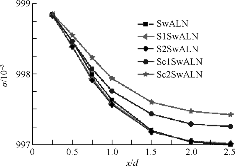 图 6为各交变波瓣沿程截面总压恢复系数,横坐标x/d为轴向离基准波瓣出口截面的距离与基准波瓣出口当量直径之比.总的来看,随着掺混的进程总压恢复系数逐渐减小,在1.0d之前减小幅度较大,在1.5d之后变得平缓.由图 6可知扇形处理前后总压恢复系数变化不大,而斜切处理可减小流动损失.