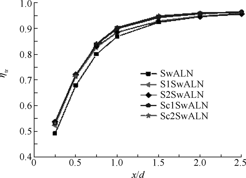 | 图 7 各交变波瓣沿程截面热混合效率 Fig 7 TThermal mixing efficiency along the axis of each alternating lobed nozzle |