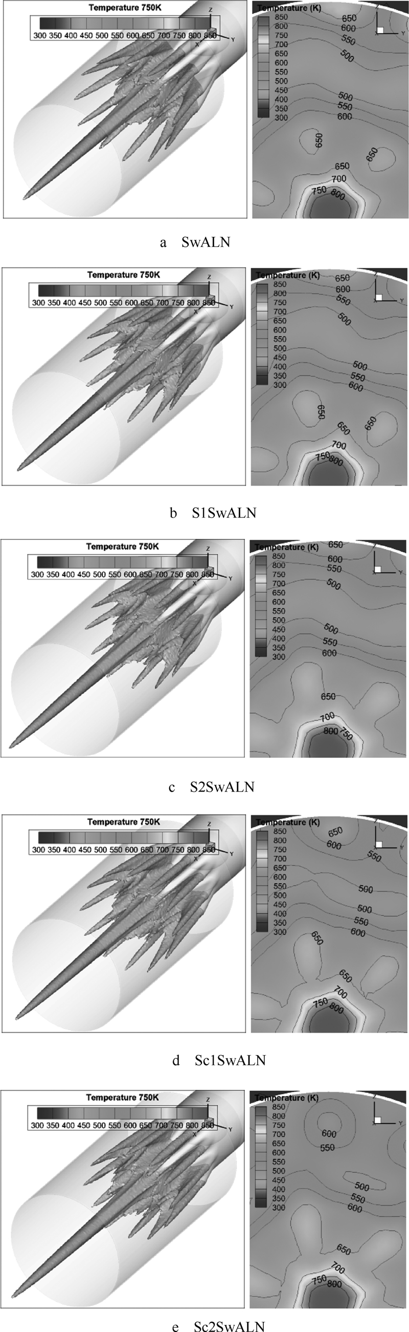 | 图 8 各交变波瓣750K温度等值面及1.5d处温度分布 Fig 8 750K temperature iso-surface and temperature contours at 1.5d of each alternating lobed nozzle |