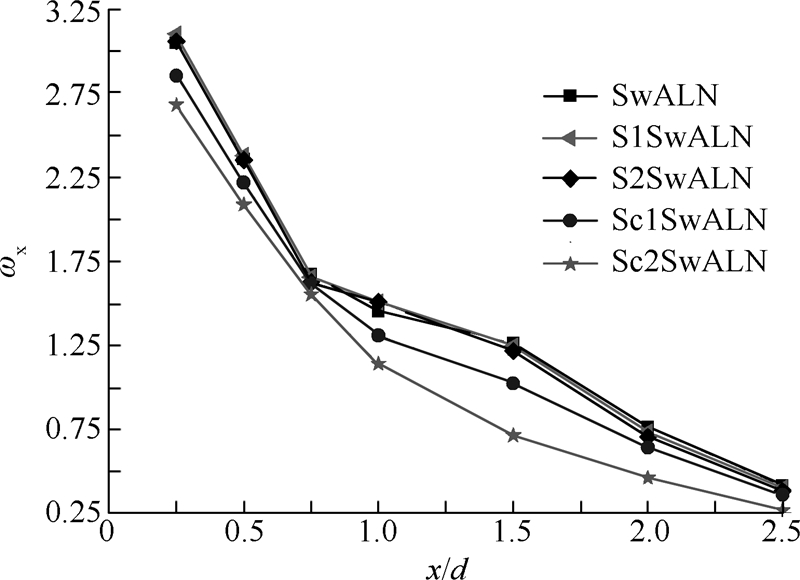 | 图 9 各交变波瓣沿程截面流向涡无量纲平均涡量 Fig 9 Nondimensional average streamwise vorticities along the axis of each alternating lobed nozzle |