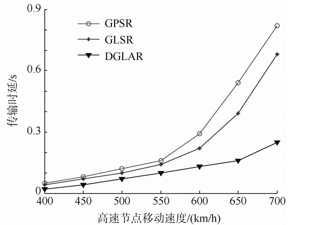 图 4表明了网络传输时延随节点移动速度的变化.从图 4可以看出,相比GPSR和GLSR算法,DGLAR能够减少网络的端到端时延,这主要是由于DGLAR同时考虑了节点移动性和负载的度量,减少了由于移动性带来的重路由和拥塞概率,相应地减少了丢包重传带来传输时延累积.