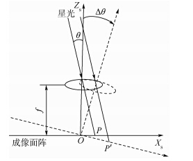 星敏感器坐标系表示为O-XsYsZs,OZs为光轴,O-XsYs为星敏感器成像面阵.以绕Ys轴转动来讨论星敏感器角运动对成像的影响,如图 1所示,光轴向右旋转Δθ角度,导致星光成像从P点向P′点移动,星敏感器曝光时间很短,因此在曝光时间内光轴近似是匀速旋转,星光的能量均匀分布到PP′这段距离,星点像移量为[9]