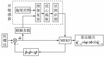 仿真流程如图 4所示,由陀螺输出的角速度信息一方面作为MEKF的输入,另一方面用来估计模糊参数,采用维纳滤波方法对拖尾星图进行复原,星图中星像的模拟采用高斯灰度扩散模型[13],然后进行星像质心提取,并采用基于K矢量查找技术[14]的星棱锥星图识别方法[15]对提取的星像进行识别,输出结果作为MEKF的观测量.MEKF输出误差状态量[Δ Δβ],其中Δ用来修正姿态误差,Δβ对陀螺漂移进行补偿,经过补偿后的陀螺输出对模糊参数的估计更加精确,从而进一步提高图像复原的效果.仿真参数设置如表 1所示.