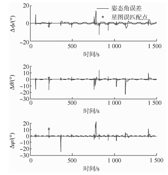 在高动态条件下会产生星图拖尾现象,使得星图的信噪比显著下降,部分暗星无法提取,导致星图中由于提取的星像少于3个或提取误差较大而无法识别的概率大大增加,在这种情况下,星敏感器不参与定姿滤波,无法修正陀螺漂移,由陀螺单独输出姿态,定姿精度较低.即使星图识别成功,由于星像质心提取误差的增加,同样会降低组合定姿的精度.更为严重的是,星像质心提取误差的增加会导致星图误匹配,使姿态误差急剧增加.图 5和图 6显示,高动态条件下组合定姿误差严重发散,在1500s的仿真时间内共发生了12次误匹配,已经不能进行姿态确定,而对星图进行复原后,无误匹配发生,且在仿真时间内都能提供高精度的定姿结果.