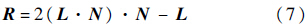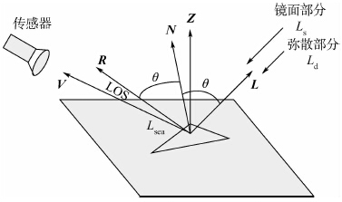 对于已经获得海面的高度分布和面元法线(场景几何模型已知)的情形,Cox和Munk的经验模型并不适用.假定每个小面元的双站反射率函数可分为镜面部分和弥散部分.根据几何光学理论,在某些观测角度下,传感器视场中将出现太阳耀斑.反射模型如图 1所示.