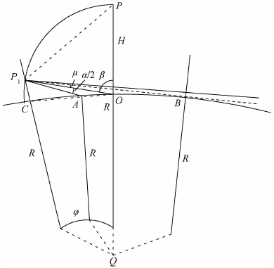当传感器的高度角很小(天顶角很大)时,天空背景将出现在光学传感器的视场中.图 2示出了传感器视场中存在天空背景时的几何关系图.假定地球为半径为R的球体.图中PO,P1O分别为垂直向下观测和视场中存在天空背景时的观测视线,长度为定值H;α为传感器垂直向视角大小,假定不存在下视角,垂直视场关于观测方向对称;β=∠POP1为传感器的观测天顶角;A,B为传感器垂直视场与海面的交点;Q为地心.P1Q与地面的交点为C,弦CO对应的圆心角为φ.