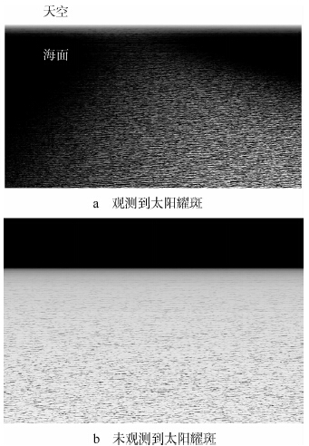 图 3为可见光谱段海天背景反射与辐射特性仿真对比图.当某些小面元的太阳辐射入射方向与传感器观测方向趋近于镜面反射时,场景中能够观测到太阳耀斑(图 3a).此时传感器面向太阳,散射路径辐射较强,天空背景明亮.随着时间的推移,镜面反射方向与传感器观测方向的夹角增大,传感器视场中的镜面分量及散射路径辐射减弱,同一观测位置不能再观测到太阳耀斑,并且天空背景变暗(图 3b).