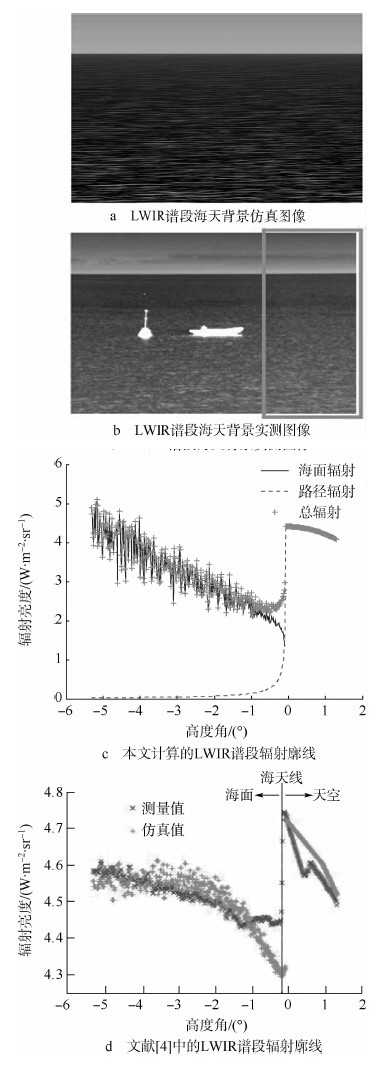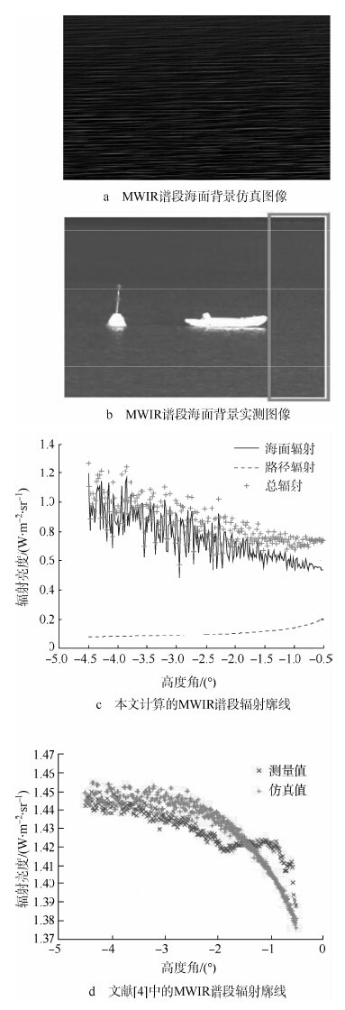 图 5为海面背景MWIR谱段反射与辐射特性仿真对比图.图 4与图 5的观测时间及气象条件均相同.由于图 5中的传感器观测天顶角及垂直视场均较图 4传感器小,故图 5中仅存在海面背景.图 5a为本文的仿真结果,图 5b为文献[4]中的实测图像.图 5c与图 5d分别为仿真图像(图 5a)与实测图像(图 5b)的背景辐射垂直向廓线.
