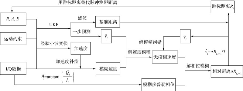 0作为距离游标的基准距离.结合得到的高精度的模糊速度可解速度模糊,得到无模糊的多普勒速度v0和v1.利用无模糊的v0和v1可以解多普勒相位增量模糊,从而得到t0和t1时刻的距离增量ΔR0,1和游标距离R1.用游标距离R1替代脉冲测距径向距离R1并利用UKF滤波作一步预测得到t2时刻的径向速度