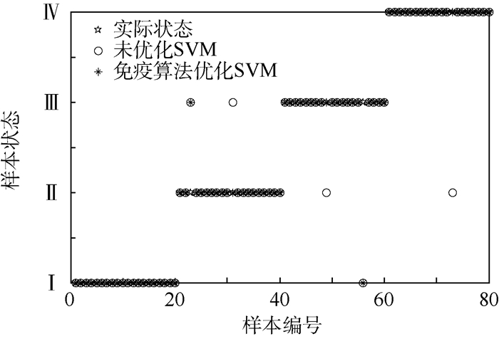选取该型航空发动机铁谱分析4种状态各20组数据作为验证样本,分别利用未经优化的支持向量机(随机选取上述3个参数)和上述训练成熟的支持向量机诊断待测样本,得到诊断结果如图 4所示,可以看出,未经优化的SVM有5组诊断错误,而经免疫算法优化后的诊断结果只有2组错误。