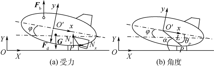 为使问题具有普遍性,假设飞艇在放飞前初始仰角为φ0。从后往前依次解除两端拉绳T2、T1的约束,飞艇前部逐渐升起。在此过程中的某一时刻,飞艇受力和角度如图 6所示。