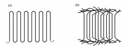 The microstructure of semi-crystalline PE strongly depends on the crystalline conditions. It is a well-established and proven fact that when a linear PE sample is crystallized from dilute solution, it forms thin crystalline lamellae with the chain axis, i.e. the crystallographic c axis in the lattice, approximately perpendicular to the lamellar surfaces[33]. The lamellar thickness is found to be in the range of 10-30 nm, which is usually much smaller than the length of a fully extended chain. Formation of such crystals invoked the concept known as chain folding, that is, long chains fold back and forth to form crystalline lamellae and folded regions give rise to non-crystalline regions. Concerning the way how PE chains fold back from non-crystalline regions and re-entry into crystalline lamellae, people have proposed two models, which are illustrated in Fig. 1.