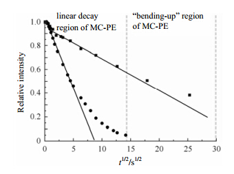 | Fig. 10 The decay of crystalline signal intensity in SC-PE (●) and MC-PE (■), plotted against the square-root of the exchange time t for two different temperatures. The experimental temperatures were 320 K[56] |