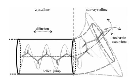 The abovementioned works exhibit uncontroverted proofs for the presence of the large amplitude helical jump in PE crystals. However, it is not logical to expect that every helical jump inevitably leads to a diffusion stem, as the jumps might be reflected by some obstacle in the crystals or annihilated by the jumps from the opposite direction. The correlation between helical jump and the chain diffusion, namely, if one helical jump inevitably results in a diffusion step of a chain stem, becomes a quite intriguing question. The above experiments monitoring the helical jump, the chain diffusion, or as well as dielectric and mechanical relaxation separately cannot tell one the relation between the movements of whole stems and local jumps of segments, which might or might not be coupled each other.