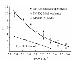 The temperature dependence of the local jump rates sheds light on this issue. Fig. 12 shows the local jump rates in PE crystals measured by 13C-13C dipole-dipole couplings (the black triangle) and double quantum MAS exchange NMR (the gray triangle). Using the chain diffusion coefficient D obtained from the 1D 13C exchange experiment, one is also able to calculate the effective jump rate, which is directly associated with the chain diffusion. These effective jump rates are plotted as the squares in Fig. 12.