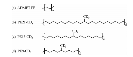 The defect-driven mechanism provides good explanation for the temperature dependence of the apparent and effective jump rates in PE crystals. But concerning the nature of the crystal defects, very few works can be found in literature. Problems lie in analytical difficulty caused by the complicated combination of limited content, unstable state, varied types, and the unclear demarcation between the defects and the normal crystal components. To deepen the understanding of the nature of the crystal defects, Spiess et al. have performed a detailed NMR study on the crystals of a series of deliberately designed polyolefins[59]. These interesting polyolefin samples have precisely spaced methyl branches in the primary chain backbone (see Fig. 13). The formed crystals thus can contain significant amount of defects induced by the precisely spaced branches. To facilitate the study of segmental mobility via 2H NMR, the fully deuterated methyl branches were introduced into the samples.