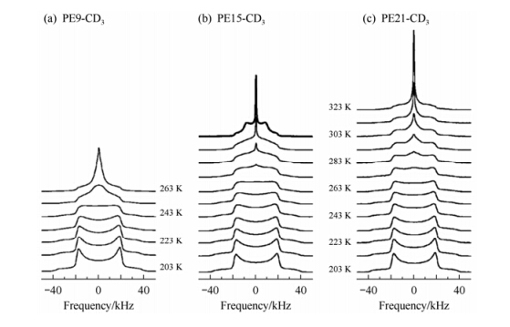 | Fig. 14 Temperature dependence of 2H NMR spectra for (a) PE9-CD3, (b) PE15-CD3, and (c) PE21-CD3. The special line shape of PE15-CD3 at T = 303 K (bold) indicates the presence of fast axial rotational dynamics[59] |