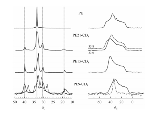 The dynamic information of chain backbone in the crystal defects of these samples is provided by the 13C CSA powder patterns obtained from the 2D CSA recoupling experiment (SUPER)[50]. Taking the advantage of the separation of isotropic CS and CSA in the SUPER experiments, the information of the local reorientations of CH2 groups of the polymer backbone can be site-selectively monitored. Fig. 15 exhibits the isotropic and anisotropic 13C chemical shifts of the samples. A remarkable finding is that the anisotropic 13C chemical shifts of the backbone CH2 groups in PE21-CD3 vary with the distance to the neighbored branching site. The NMR signal at d 33.2, which is likely from the backbone CH2 groups close to the methyl branch, is associated to the CSA powder pattern with the lineshape of an almost axially symmetric CSA tensor, where the principal value of d 13 along the crystalline c axis persists and the two other values are largely averaged. Whereas, the CSA line shapes for the MAS NMR signal at d 33.6 shows a CSA tensor line shape similar to that of PE. This variation on the lineshape of the 13C powder pattern indicates the presence of the rotation of all-trans conformer with different amplitudes. Different from PE21-CD3, the CH2 signals in the crystalline regions of PE15-CD3 areobserved at d 32.9 with a shoulder at about half the signal height at d 33.5. Remarkably, all 13C signals in the NMR spectrum of PE15-CD3 show the powder line shape of well-defined axially symmetric CSA tensors; even at d 33.5, the isotropic chemical shift characteristic of undistorted all-trans units. Thus, whereas in PE21-CD3 the CH2 groups in proximity to the lattice-perturbing methyl branches perform local motions as found in pinned defects, the rotation in PE15-CD3 at T = 303 K involves all the CH2 groups along a given polymer chain and thus shows collective behavior as in a rotator phase, which was also deduced from X-ray data[60].