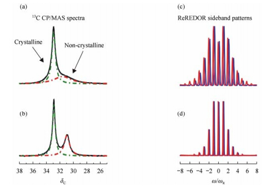 | Fig. 2 The 13C CP/MAS spectra (6 kHz MAS, 2 ms CP contact) of PEs and ReREDOR[45, 46] sideband patterns (25 kHz MAS, 3 rotor periods recoupling) from the non-crystalline regions, recorded at T = 320 K. The 13C CP/MAS spectra of (a) solution crystallized and (b) melt crystallized PE show two components, the non-crystalline signal (~d 31, red dashed line) and the crystal peak (~d 33, green dashed line). The ReREDOR sideband pattern of non-crystalline, [(c), red line] solution crystallized and of non-crystalline [(d), red line] melt crystallized PE. The underlying blue pattern are simulations with a dipole-dipole coupling constant of DIS/2p = 9.1 kHz for the solution crystallized sample and 6.3 kHz for the melt crystallized sample[40(b)] |