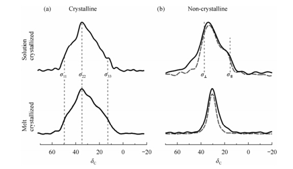 | Fig. 3 The 13C chemical shift anisotropy (CSA) static powder line shape of the two PEs: (a) the crystalline pattern and (b) the non-crystalline pattern. These patterns are taken from the slices of SUPER experiments[50], measured at 3 kHz MAS and T = 320 K. Spectra given in solid black lines were measured with 1H-13C cross-polarization, those given in dashed gray lines were measured via 13C single pulse excitation[40(b)] |