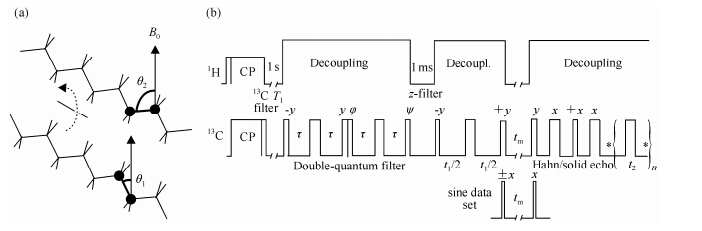 By 2D exchange spectrum of the 13C-13C dipolar coupling in 13C-13C pair labeled PE, the helical jump in PE was first directly observed by Schmidt-Rohr’s group[53], where they monitered the 180° helical jump in terms of the reorientation of 13C-13C internuclear vectors in the crystallites of 5% 13C-13C pair labeled PE. The cartoon picture in Fig. 4(a) illustrates the C-C bonds reorientation process from q1 to q2. During this reorientation process, the dipolar coupling of 13C-13C pair will change the orientation angle and thus the dipolar frequency. The correlation function of the chain reorientation thus can be measured directly in terms of the mixing time dependence of stimulated echoes of the dipolar coupling by the pulse sequence in Fig. 4(b).