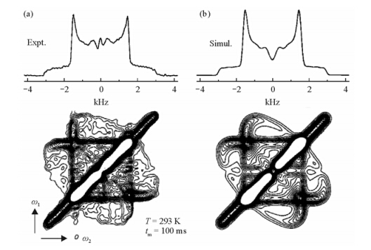 | Fig. 5 2D exchange spectrum of the 13C-13C dipolar coupling in 13C-13C pair labeled HDPE. (a) Experimental spectrum, T = 293 K, tm = 100 ms. (b) Corresponding simulation for 180° flips. Thirty contour lines are plotted between 0.8% and 20% of the maximum intensity. The slight asymmetry of the spectrum is due to the double-quantum filter, which does not excite equally the signals for all 13C-13C orientations. Integral projections onto the w2axis are shown at the top[53] |