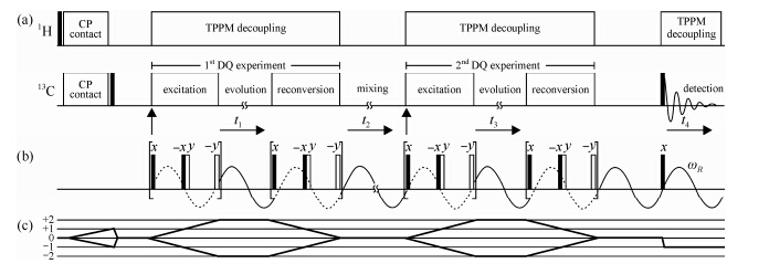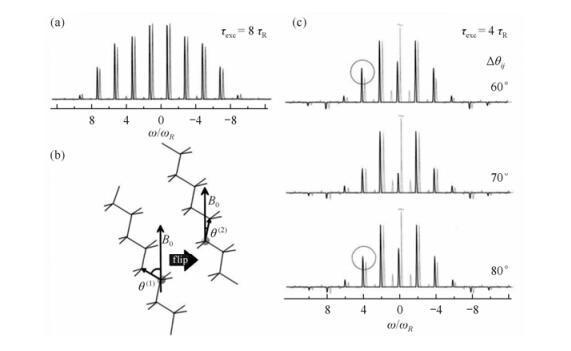 Using the same labeled PE sample, Schnell et al. demonstrated another NMR technique for directly monitoring the 180° jump in PE crystals[54]. The pulse sequence used is exhibited in Fig. 6, which actually is a reduced 3D experiment consisting of two dipolar double-quantum (DQ) MAS experiment blocks. The dipolar coupling between the13C-13C spin pairs is used to generate the DQ coherences in the first and second dimension. The jump motion occurring during the mixing time thus can be monitored via probing the 13C-13C dipolar coupling tensors because of its orientation dependence. Fig. 7(a) shows the 13C-13C DQ MAS sideband pattern from the rotor encoded DQ sideband experiment. Simulation yields a 13C-13C dipolar coupling strength of Dij = 2p (1.89 ± 0.01) kHz. Fig. 7(c) exhibits the sideband patterns obtained using the pulse sequence in Fig. 8. In these sideband patterns, the center band reflects moieties which have remained in, or returned to, their initial position during the mixing time, whereas the sidebands predominantly contain the contributions from the moieties which have undergone a reorientation during the mixing time. Simulation shows that the 13C-13C reorientation angle in the PE crystallites is 70 ± 5°, similar as that observed by Schmidt-Rohr.
