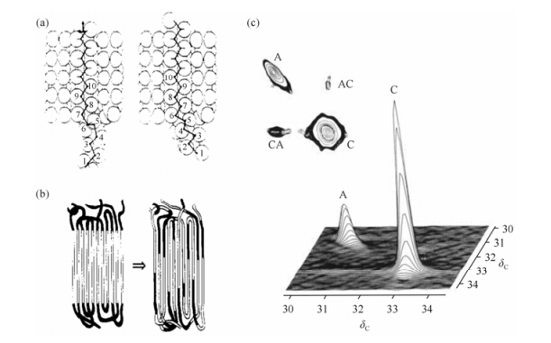 Concerning the chain connectivity, the helical jump in polymer crystals can be considered as good indicative of the presence of chain diffusion between amorphous and crystalline regions. In literature, the first direct experimental evidence for the chain diffusion between amorphous and crystalline regions of semi-crystalline polymer was demonstrated in high molecular weight PE by Schmidt-Rohr and Spiess[55]. Using 2D 13C MAS exchange NMR, they showed a clear exchange process present between the local conformations in the amorphous and crystalline regions of PE at elevated temperatures. Fig. 8(c) is the 2D MAS exchange spectrum of UHMW-PE given in the work (acquired at 363 K with an exchange time of 1 s). The appearance of off-diagonal peak in the spectrum indicates that the large scale chain diffusion between crystalline and amorphous regions occurs on the time scale of several seconds.